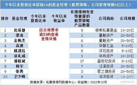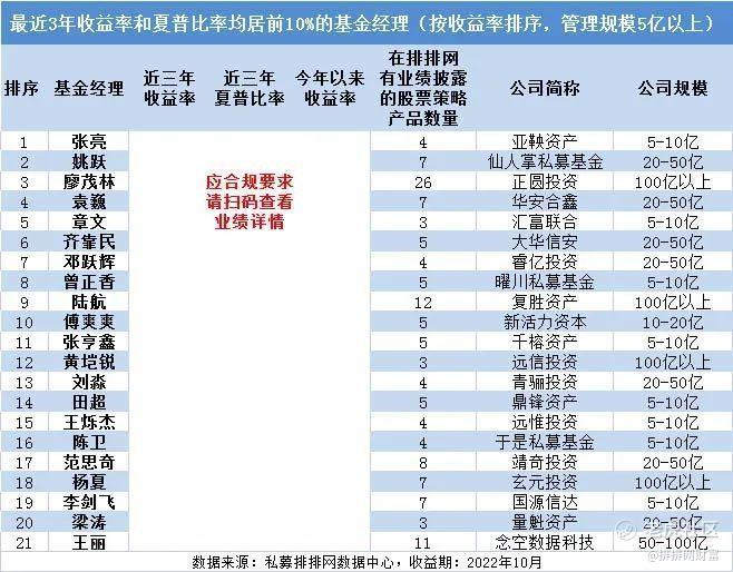 为了给投资者更好的参考,笔者在1141位基金经理中,按照“名下管理的运行中股票策略产品数量在3只(包含3只)以上,3只(包含3只)以上产品10月净值已更新,并且公司规模大于5亿元”的规则,筛选出今年和近三年高夏普的10强基金经理名单,供读者参考。