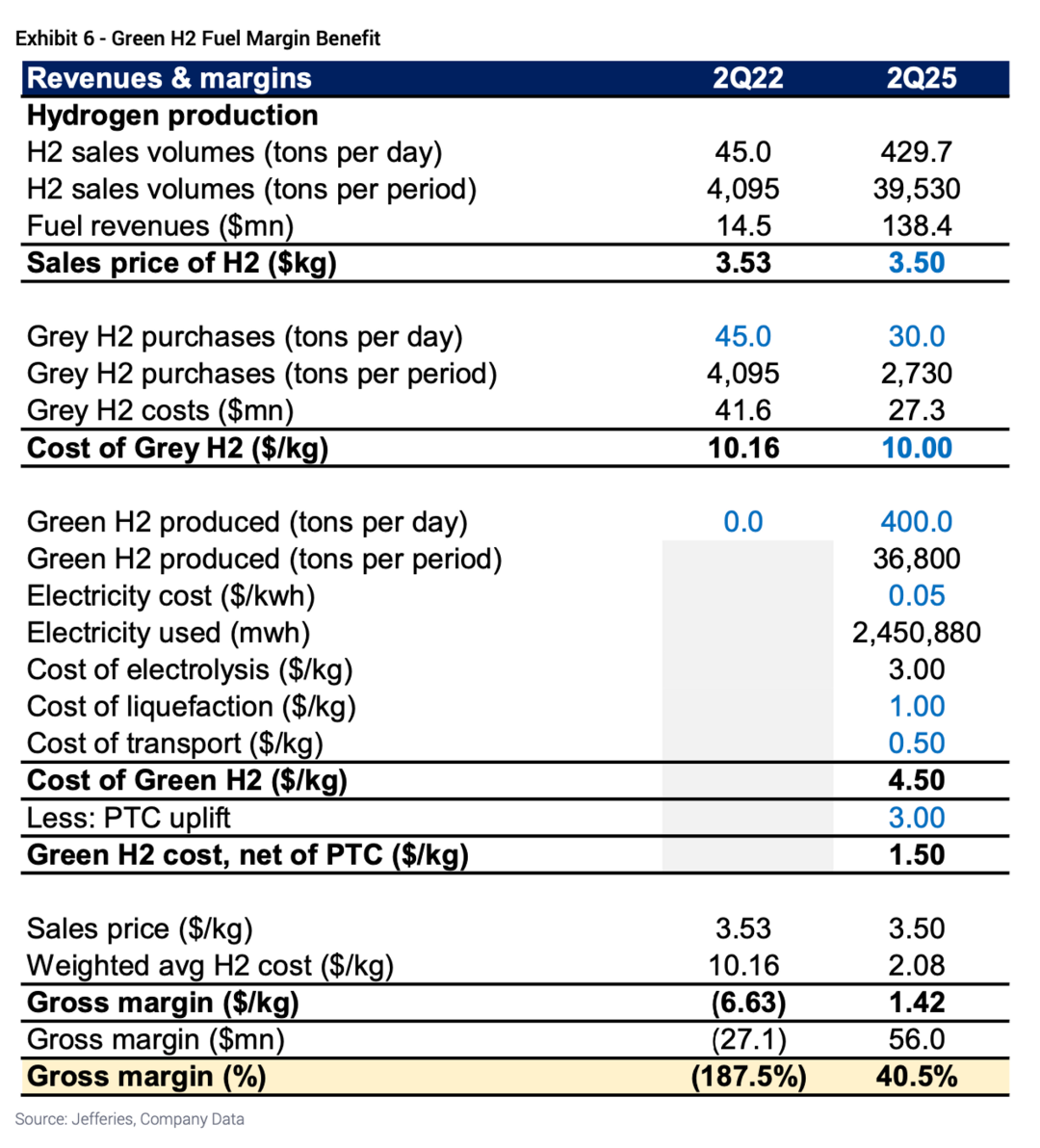 根据Jefferies的推算,假设2025年公司可以达到430吨的产能,绿氢的成本达到4.5美金每千克,加上拜登今年签署的《降低通货膨胀法案》对绿色氢气的价值3 美元/公斤的生产税收抵免(production tax credit-PTC),届时公司的毛利能达到40%。