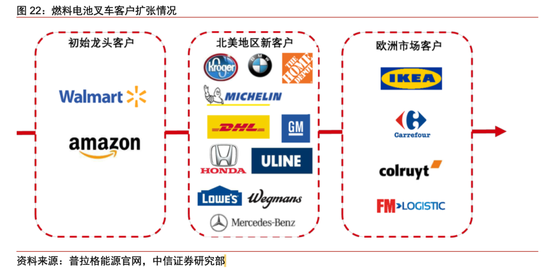 2014 年开始,沃尔玛便成为公司的主要客户。2015 年,沃尔玛与公司的合作进 一步加大。2017 年普拉格公司与富国银行签订回租租赁合同,向其出售燃料电池系统和氢气基础设施。2017 年,公司与亚马逊开启合作。公司与亚马逊签订交易协议,向亚马逊全资子公司发行认股权证,购买了5500万股普通股。