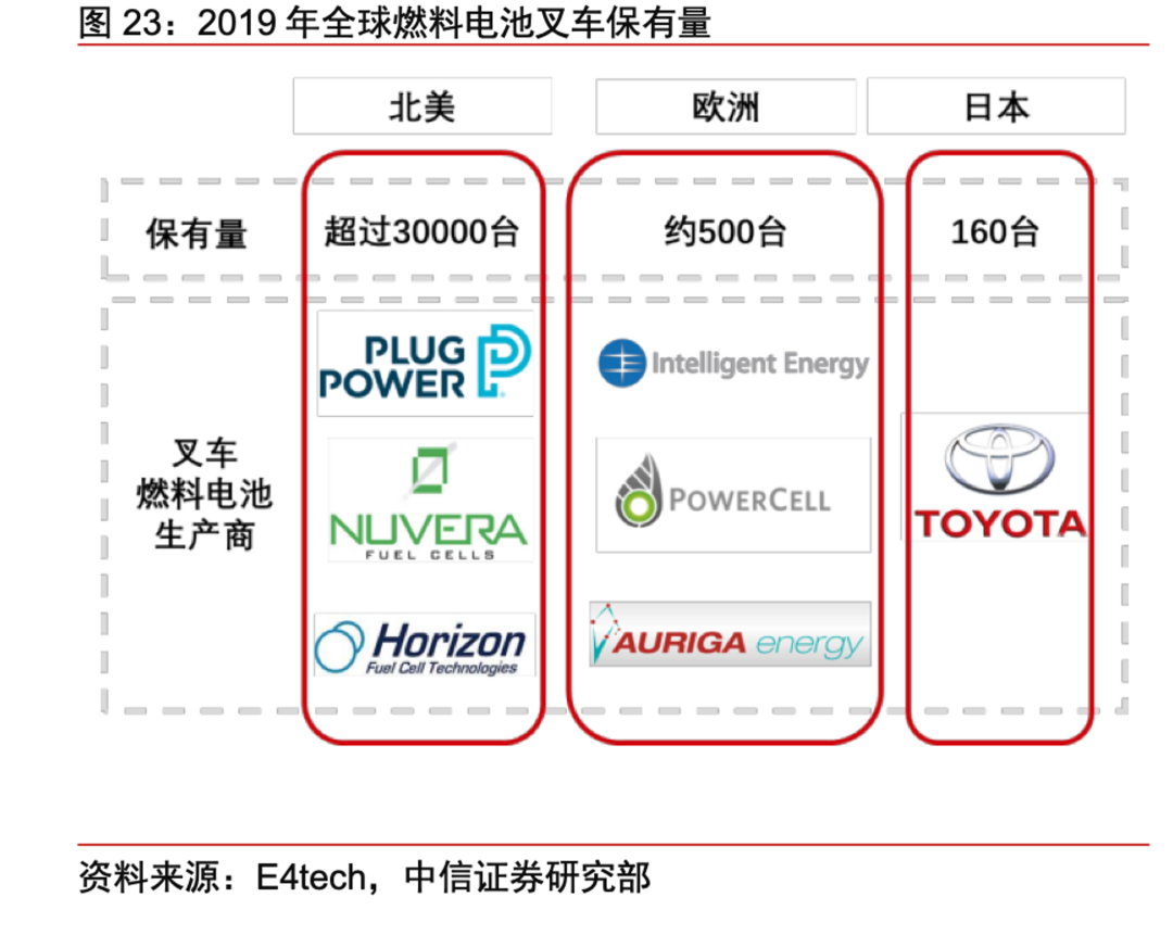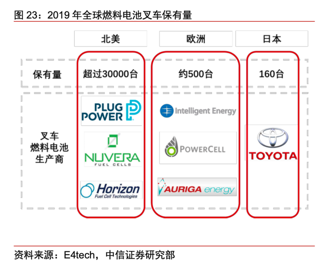 叉车市场:根据E4tech的统计,2019年燃料电池叉销量为3万台左右,占全球叉车销量的2%。