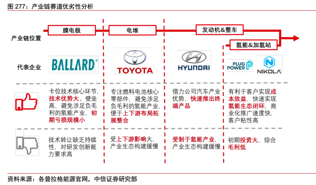 (3) 专注整车产品: 代表公司现代汽车,此类公司布局发动机和整车,能够借力汽车产业快速推出终端产品面向市场,但受制于氢能基础设施不足。(来源:中信证券)