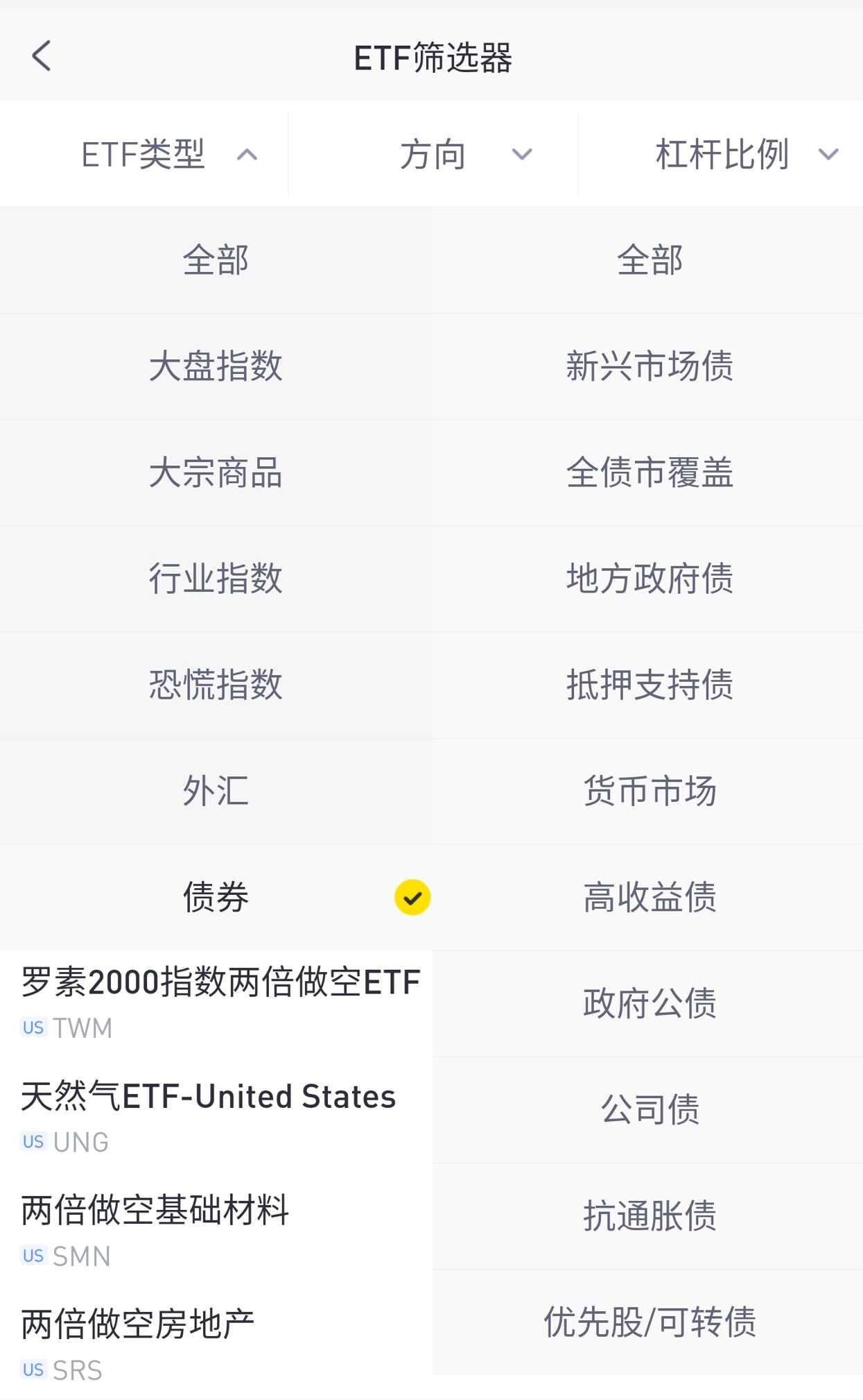 打开 老虎国际app 的“热门ETF”板块,选择“智能筛选”,在ETF类型中选择“债券”,便可看到各种类型的债券型ETF。
