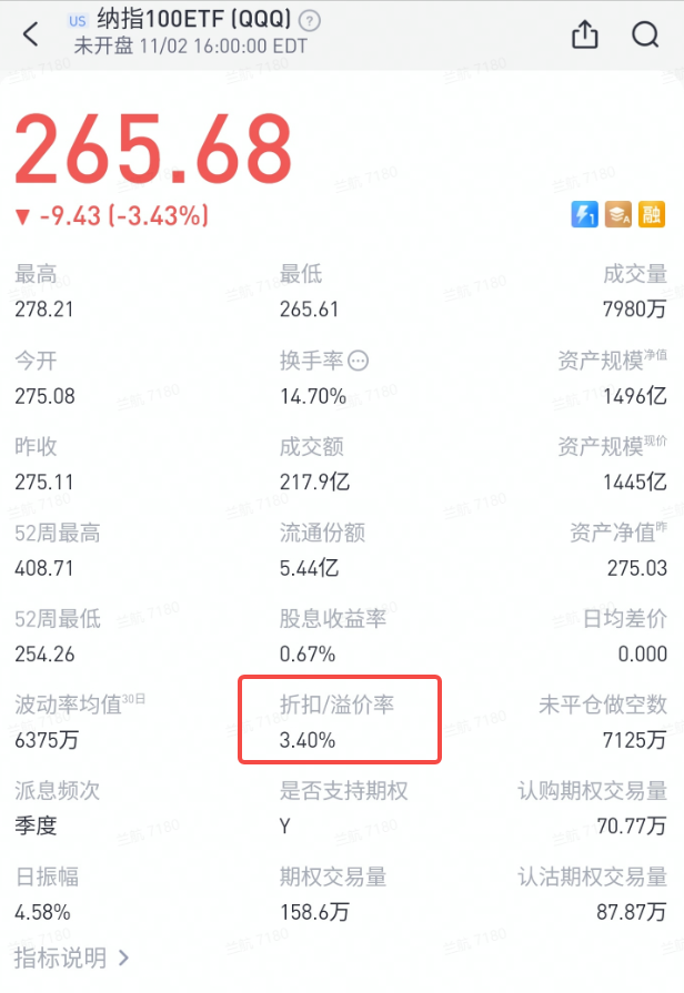 举个例子,在 老虎国际 app 中搜索纳指100ETF(QQQ),在行情界面中可以找到折溢价数据:
