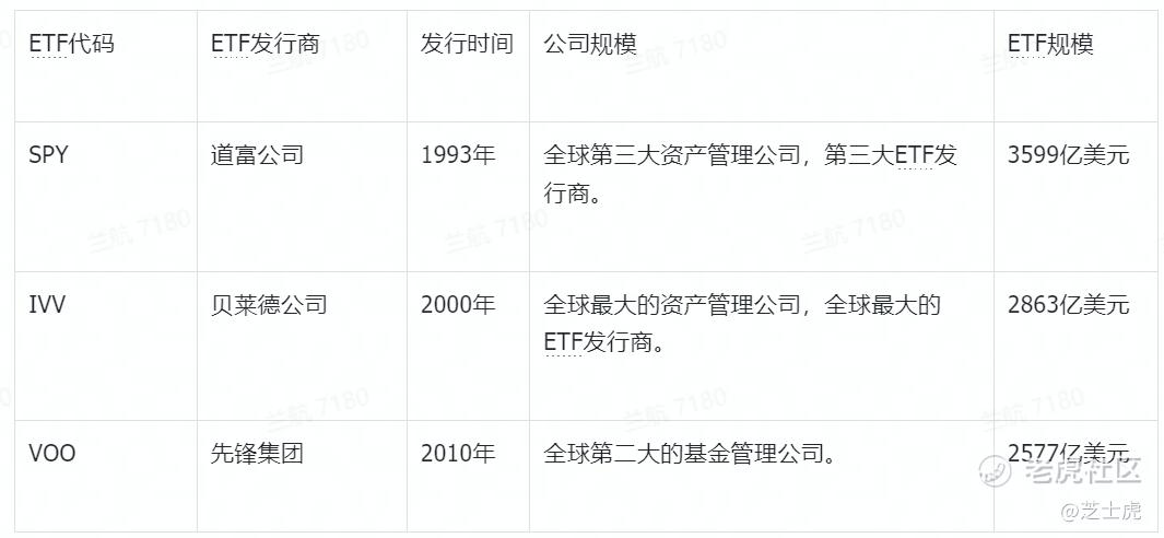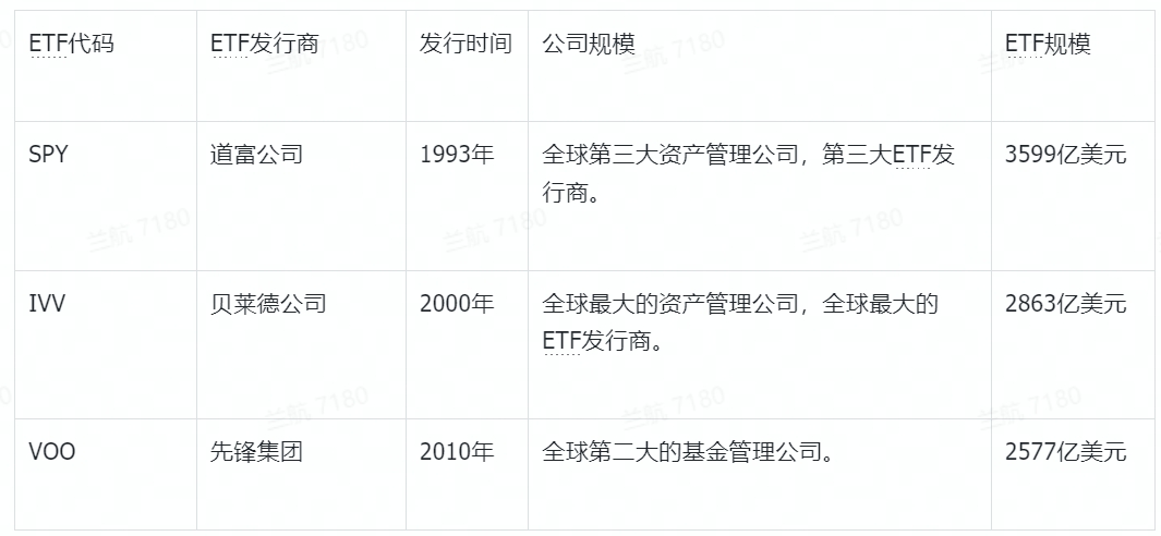 最后一步是看ETF发行商和ETF规模。同样我以跟踪标普500指数的三支ETF为例: