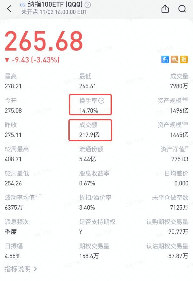 一般来说,常见的ETF流动性指标主要看场内换手率,场内成交额。以纳指100ETF(QQQ)为例,在老虎国际 app 的行情页面可以看到: