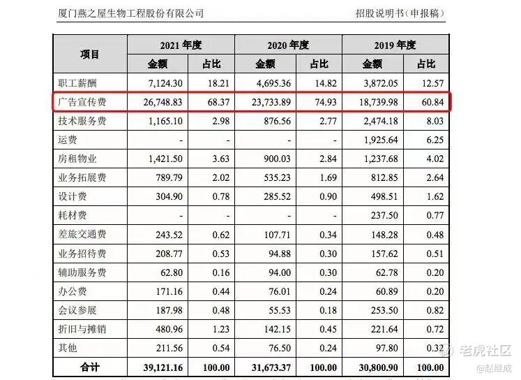 2019年至2021年,燕之屋的销售费用分别为3.08亿元、3.83亿元、4.51亿元,占营收比例分别为32.40%、29.50%和30.08%。其中,广告宣传费分别为1.87亿元、2.37亿元和2.67亿元,占营收的比例分别为19.72%、18.27%、17.85%。