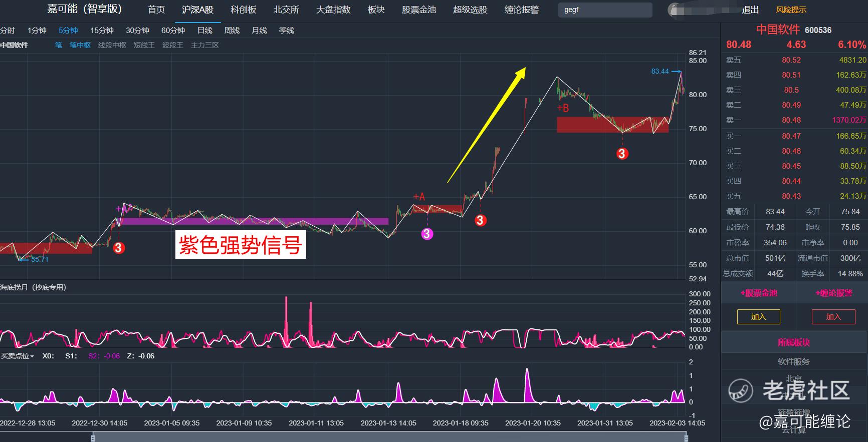 换而言之,如果你是交易短线的,倒是可以考虑。或者直接从每天涨停板里面找5分/30分钟存在强势信号的个股。比如,前期强势的中国软件(600536)也属于5分钟级别上出现连续性的缠论强势信号。如下图所示: