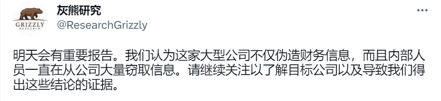 3月1日,著名做空研究机构灰熊(Grizzly Research)发布了一则消息,将在美东时间3月2日 23:30(北京时间3月3日凌晨0:30)公布他们新的“做空标的”。据称,这家公司不仅伪造财务信息,而且内部人员一直在从公司大量窃取。