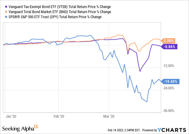MINT focuses on short-term bonds, so interest rate risk is quite a bit lower relative to VTEB. Expect significant outperformance from MINT during periods of rising interest rates, as was the case in 2022.