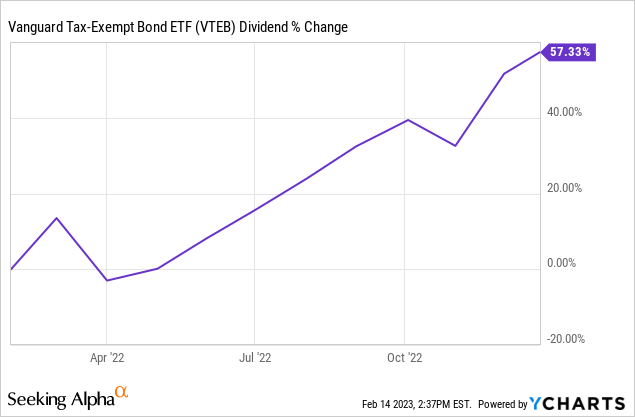 On a more positive note, VTEB's dividends and dividend yield will both likely see some growth in the coming months, courtesy of Federal Reserve rate hikes. Higher Fed rates mean higher muni bond interest rates, which means higher income for the fund, which ultimately results in higher dividends for the fund's shareholders. The process is slow and gradual, but has already started, with fund dividends growing over 57% in 2022.