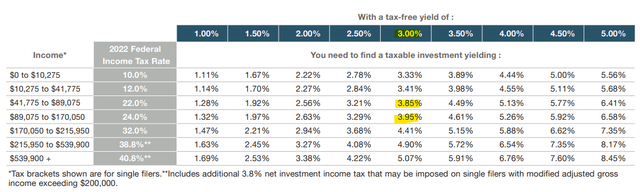The specific magnitude or impact of these savings is dependent on dividends received, federal income tax rates, and the specific circumstances of each individual investor. These specific issues are outside the scope of this article, but I'll provide a quick table of tax-equivalent yields that might be of use. In simple terms, the table lets you compare tax-free yields with equivalent taxable yields depending on your tax rate. VTEB's 3.1% SEC yield is equivalent to a 4.0% taxable yield for most investors, although figures do vary depending on an investor's tax bracket.