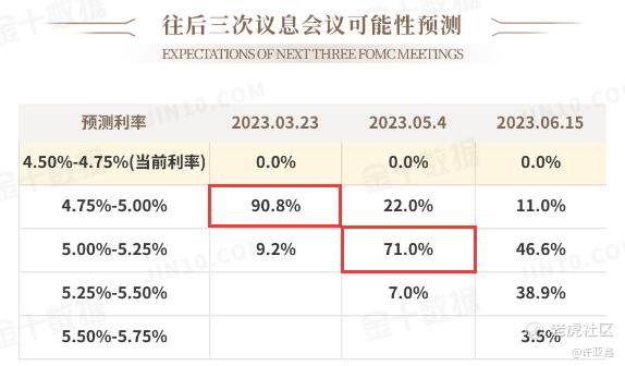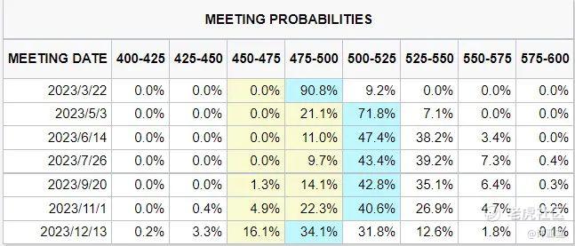 据CME“美联储观察”:美联储3月加息25个基点至4.75%-5.00%区间的概率为90.8%,加息50个基点至5.00%-5.25%区间的概率为9.2%;到5月累计加息25个基点的概率为22.0%,累计加息50个基点的概率为71.0%,累计加息75个基点至5.25%-5.50%区间的概率为7.0%。