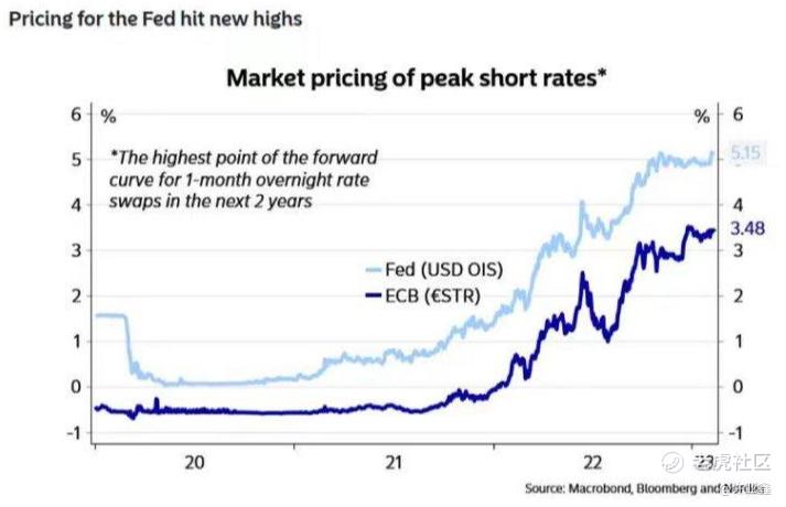 如上图所示,市场定价美联储的利率峰值上周创下了5%以上的新高,而定价欧洲央行进一步加息超过100个基点。