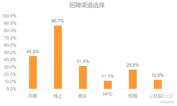 从不同行业来看,消费品行业在线上渠道的选择更为明显,专业服务外包行业则更多地选择内推渠道,RPO渠道的选择各行业显得比较均衡,能源、制药医疗、交通物流、汽车制造、金融等行业则选择校园渠道相对较多,汽车制造和金融行业则在社交渠道的使用上更为积极。金融机构近年来更加关注雇主品牌,开始通过新媒体等渠道覆盖更多业务人才和技术人才。