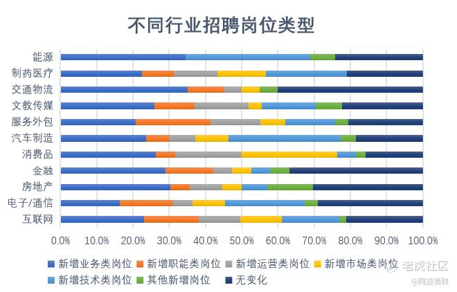 一季度大多数行业都在计划新增业务类岗位,汽车制造、能源、电子通信和制药医疗行业对技术类岗位需求明显,消费品行业则突出了对市场类岗位的需求。