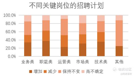 关键岗位的招聘计划来看,业务类、职能类和技术类岗位的招聘增加比较明显;其他类岗位则基本保持不变,说明一季度企业倾向于更多跟随市场变动采用跟随市场情况的态度来进行关键岗位的配置。