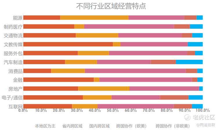 从不同行业的经营特点来看,各行业都呈现出企业经营特点与去年基本保持一致,主要以国内区域经营为主,本地、省内、国内跨区域等基本占据各行业的八成左右。可以看到文教传媒和金融行业在本地区经营的比例有所增加,这与行业的深入升级关系紧密;在消费品领域可以看到更多的是以省内跨区域和国内跨区域经营,这是与消费行业的进一步提振所带来的行业布局。