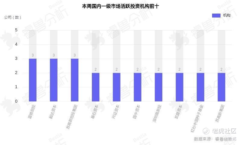 从机构投资活跃度来看,蓝驰创投(3个)、毅达资本(3个)、苏高新创投集团(3个)、基石资本(2个)、兴证资本(2个)在本周创投市场中较为活跃。
