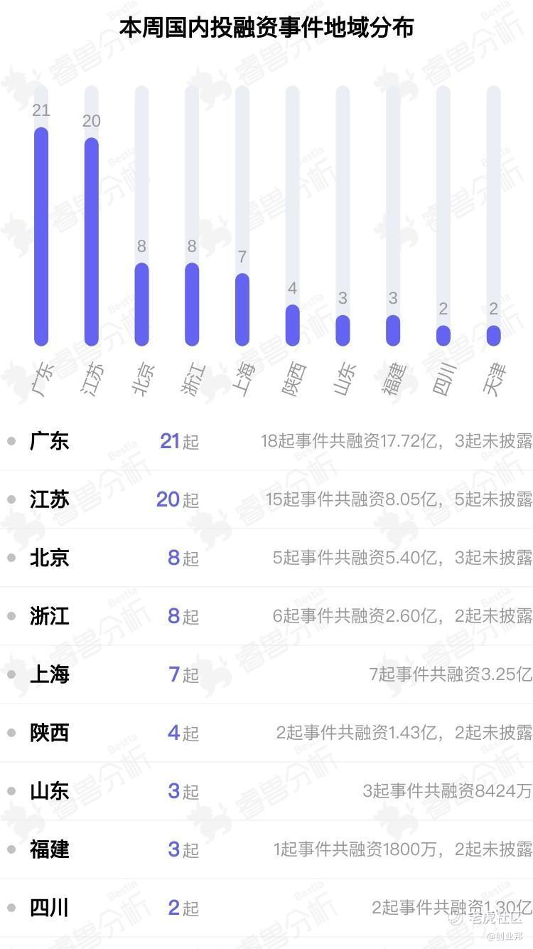 从本周披露获投企业的地域分布来看,主要集中在广东、江苏、北京。其中广东披露21个,江苏披露20个,北京披露8个。