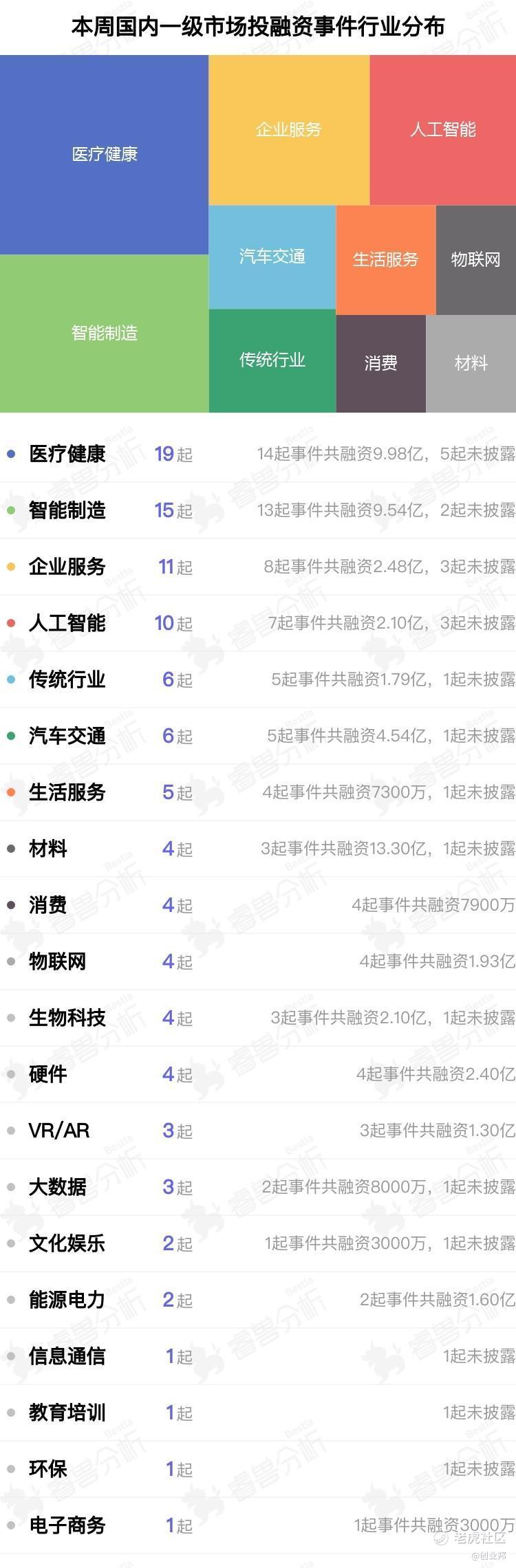 从融资案例数量来看,本周医疗健康、智能制造、企业服务领域融资最活跃,分别为19个、15个、11个。