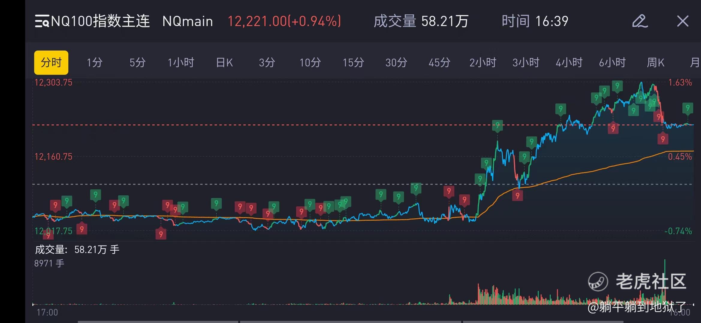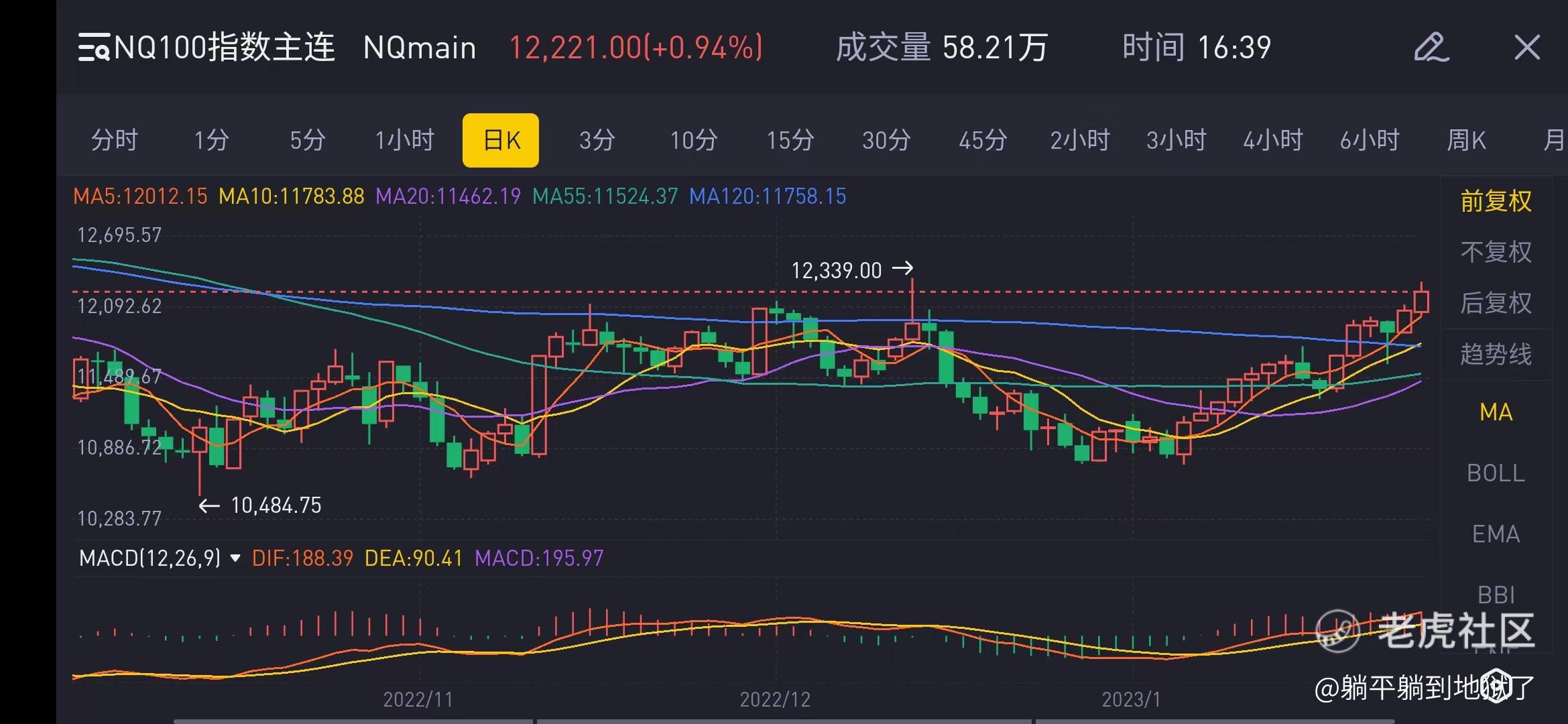 昨日分时走势:美东时间1月26日18:00NQ100期货开盘后略弱于上一个交易日开盘走势。强势小幅下跌调整,盘前5时10时20时均线粘合,微跌。1月27日9:30美股小幅低开后,快速拉升,10:00后振荡回调至日内均线(5时均)后开始日内主升行情,最高冲至12308.5点受前高12339点压制,15:00快速回调,收报12221点,0.94%,缩量带上影线中阳线。(周放量收实体中阳线,周涨4.73%,周线4连阳)。