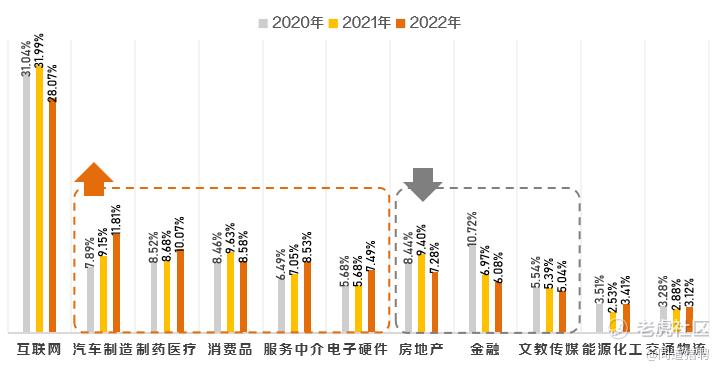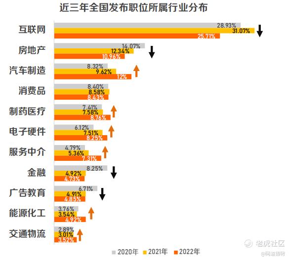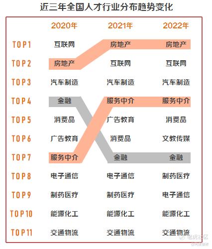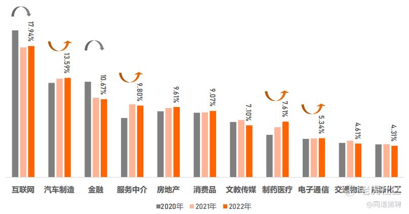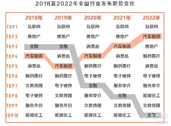 从全国职位发布需求来看,2022年互联网、房地产、汽车制造人才需求热度不减,但房地产行业虽在职位发布TOP2的位置,但对比3年前,占比下降4个点。