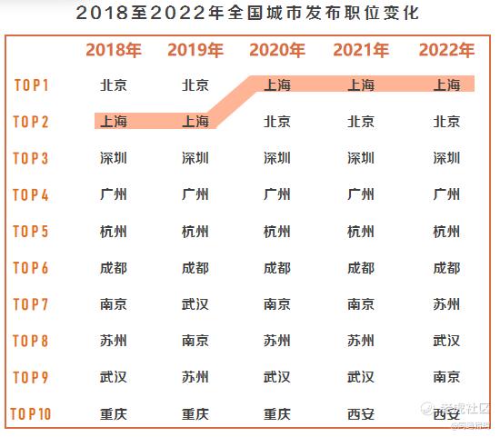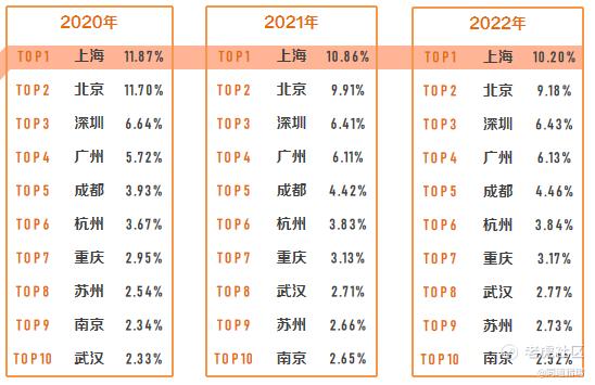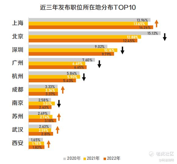 上海地区职位发布相较2020年的13.96%下降了0.3个点,但仍旧是2022年全国职位发布量最大的城市,作为十四五规划的第一年,同时近几年上海地区疫情控制十分稳定,是企业良好发展的摇篮,上海重点产业对中高端人才需求加剧,职位发布量连续三年占据榜首位置。