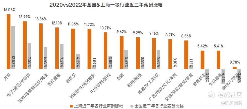 2020年至2022年,全国大部分行业薪酬均有增长,其中汽车、电子通信及医疗健康行业涨幅最高,位列前三,分别为16.06%、13.99%、12.18%;而教育培训、房地产及生活服务三大行业因相关政策及疫情影响等不可抗力因素,全国范围下近三年薪酬呈负增长趋势,较多相关企业采用降薪措施度过生存寒冬。