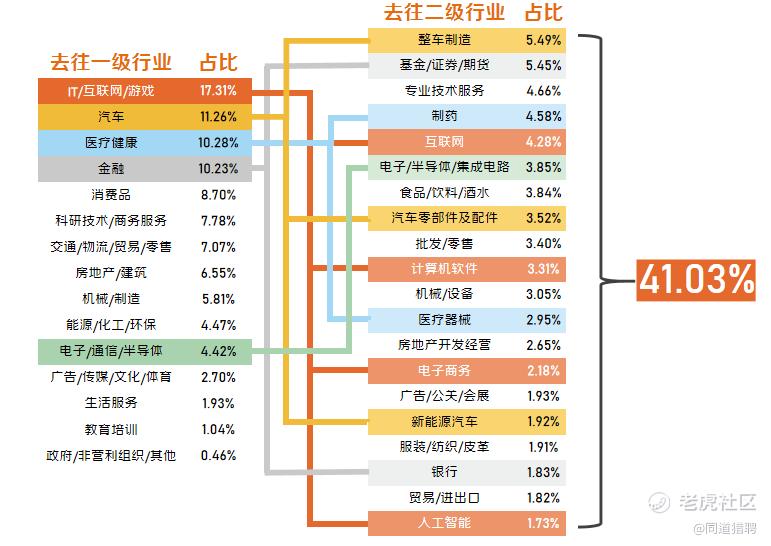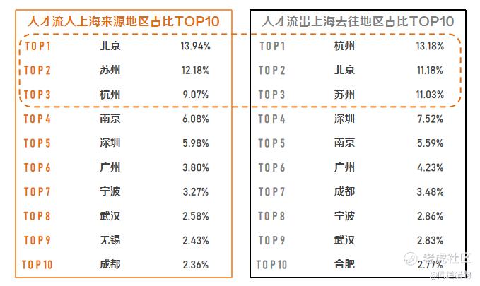 随着上海十四五规划中相关核心重点领域产业,如半导体、生物医药、人工智能、新能源汽车的快速发展,人才缺口较大,同时薪酬及涨幅皆领跑全国,跨区域流入上海地区的人才中,去向前20的二级行业中,有将近4成人才会选择这些行业进行就业;金融行业作为上海乃至全国薪酬排名第一的高薪行业,也吸引了10.23%的人才流入,而其二级行业基金证券期货,也位列上海引才细分行业第二名,占比为5.45%。