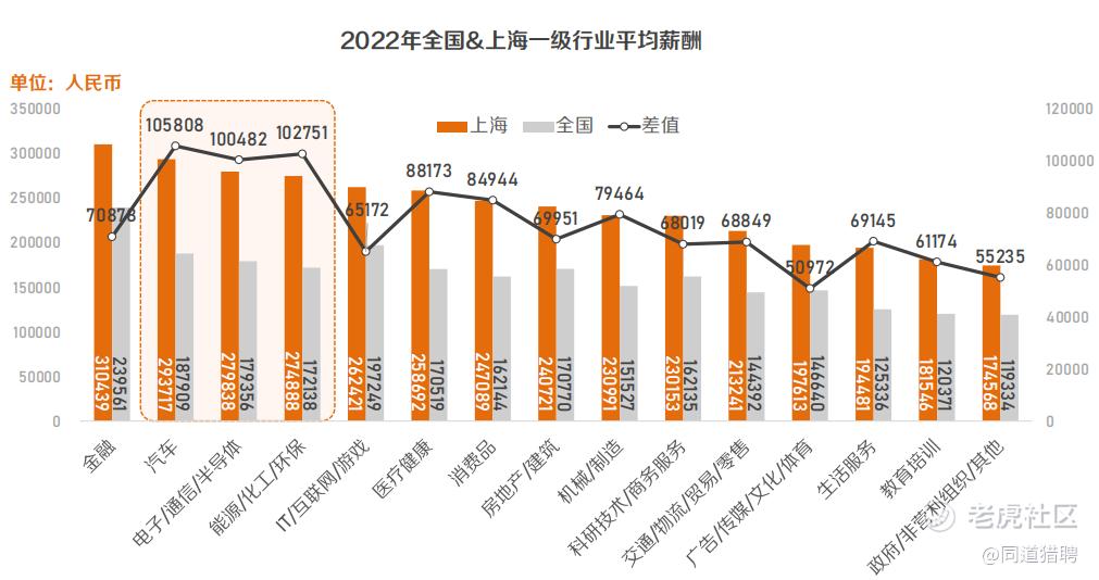 2022年上海地区中高端人才平均薪酬为25万元,全国中高端人才平均薪酬为15.34万元。金融及汽车行业在上海及全国范围薪酬都具有较大吸引力,薪酬排位都位列前三,上海金融行业人才均薪更是突破30W;其中上海对比全国薪酬差值较大的行业,如:汽车,电子通信,能源化工等薪酬差值都超过10W元,这些行业在跨区域人才吸引上有较大优势。