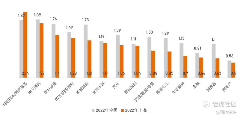从全国和上海的2022年行业人才稀缺指数来看,科研、医疗、电子相关行业相关人才稀缺度均位列前三,中高端人才需求热度高涨;上海近3年在生物医药、集成电路领域的多方布局,在临港、张江、奉贤的园区重点发力,逐渐形成城市吸引力,相对于全国稀缺度稍缓;上海地区对于科研技术/商务服务行业人才需求迫切,TSI指数超过2,急需布局吸引高精尖硕博类科研人才。