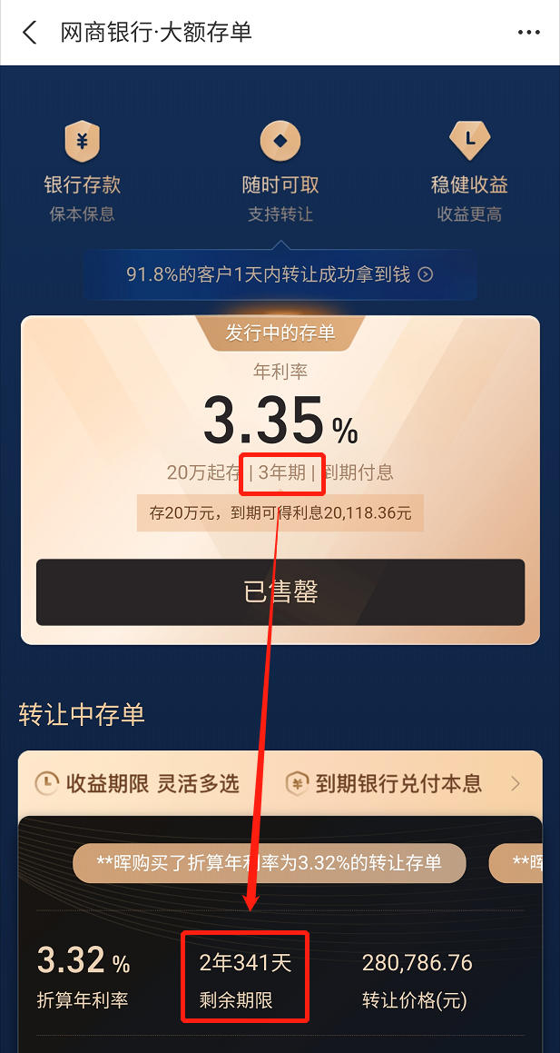 像农行的存单转让区,动辄都是50万/100万本金转让,很难立刻找到接盘侠。