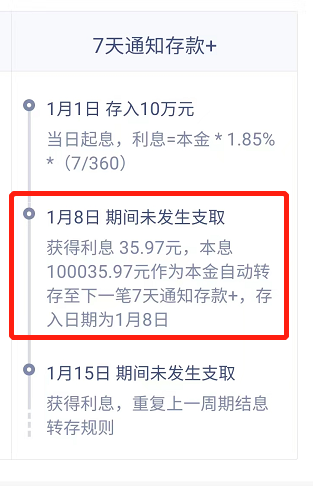 每存满一个7天,本金+利息会自动转存,自动吃新利息。
