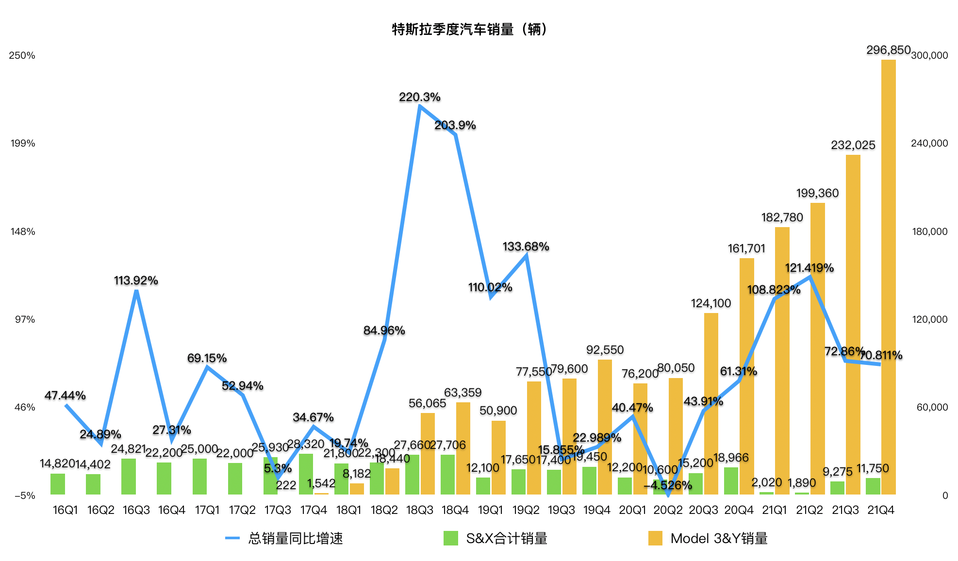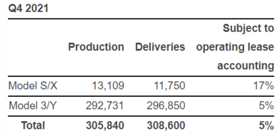 先来看看交付数据,尽管受到芯片短缺影响,特斯拉第3季度电动车交付量仍然耀眼,第四季度,特斯拉在全球交付了30.86万辆汽车,打破了该公司此前的纪录,比市场预期高出约15%,其中Model S和Model X车型的产量为13109辆,交付量为11750辆;Model 3和Model Y产量为292731辆,交付量为296850辆。这推动特斯拉全年交付量超过93.6万辆,较2020年略低于50万辆的交付量增长约87%,大幅超过此前给予的年交付量80万辆的交付预期。