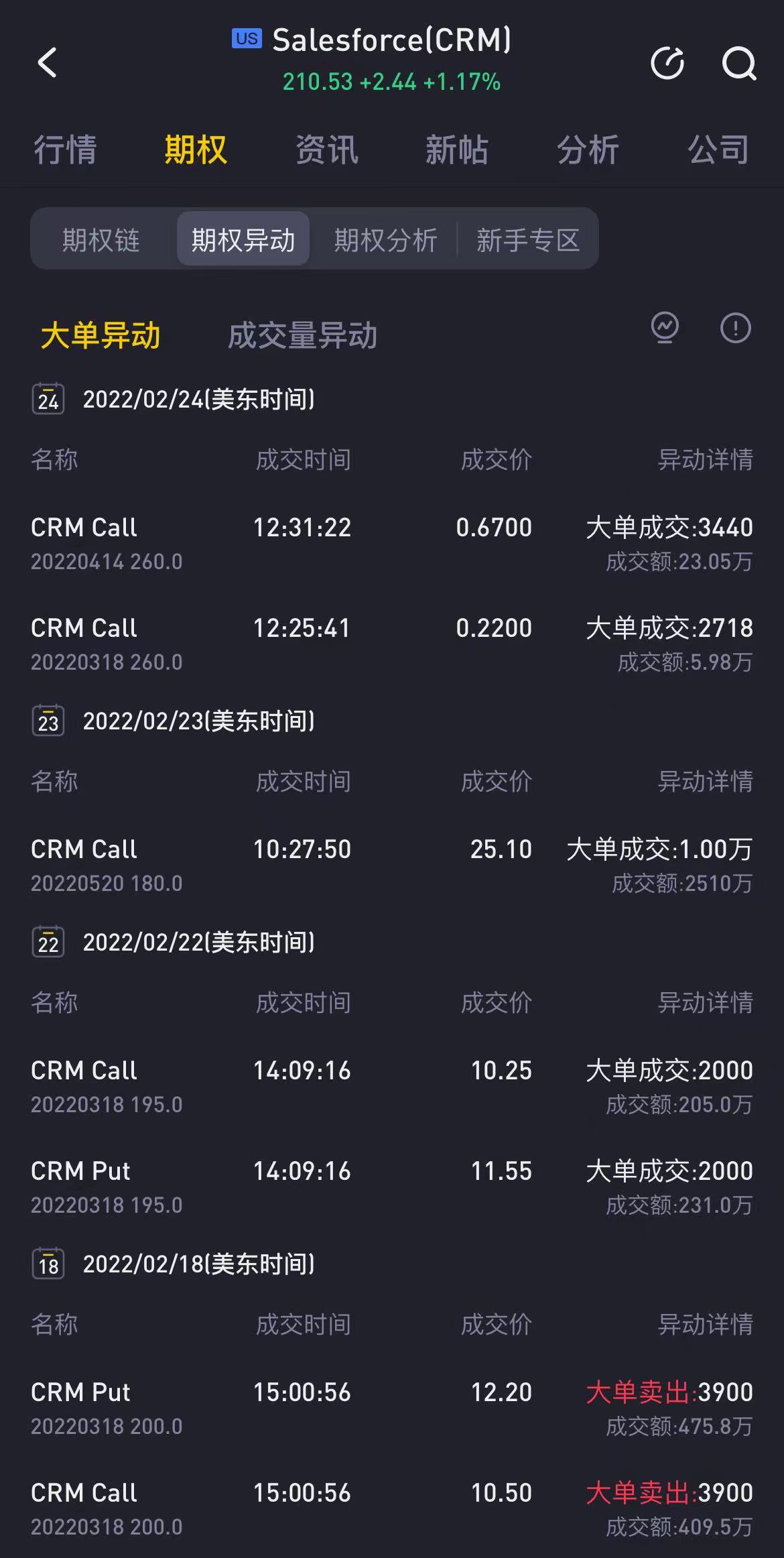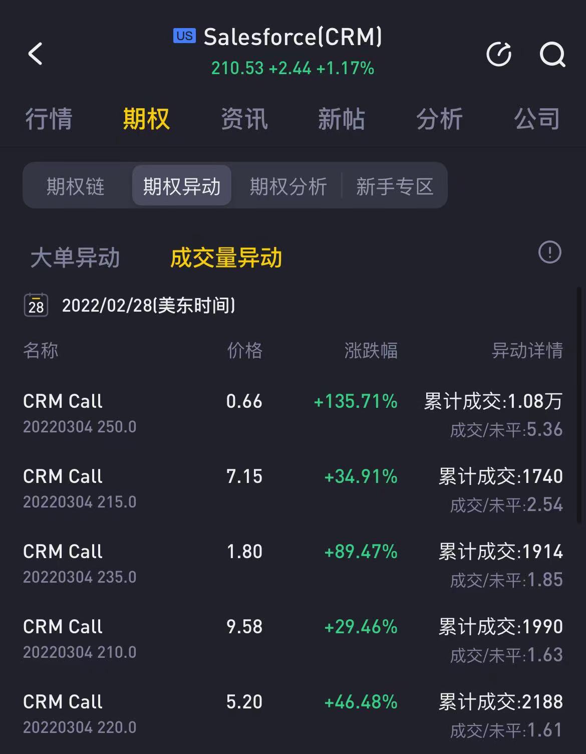 第二家介绍的财报是$Salesforce(CRM)$ ,周二盘后财报,根据大单异动选出$CRM 20220414 260.0 CALL$,也就是说这张期权要拿到财报公布,但胜在价格便宜,亏了也没多少钱。预计COST期权利润可以覆盖。