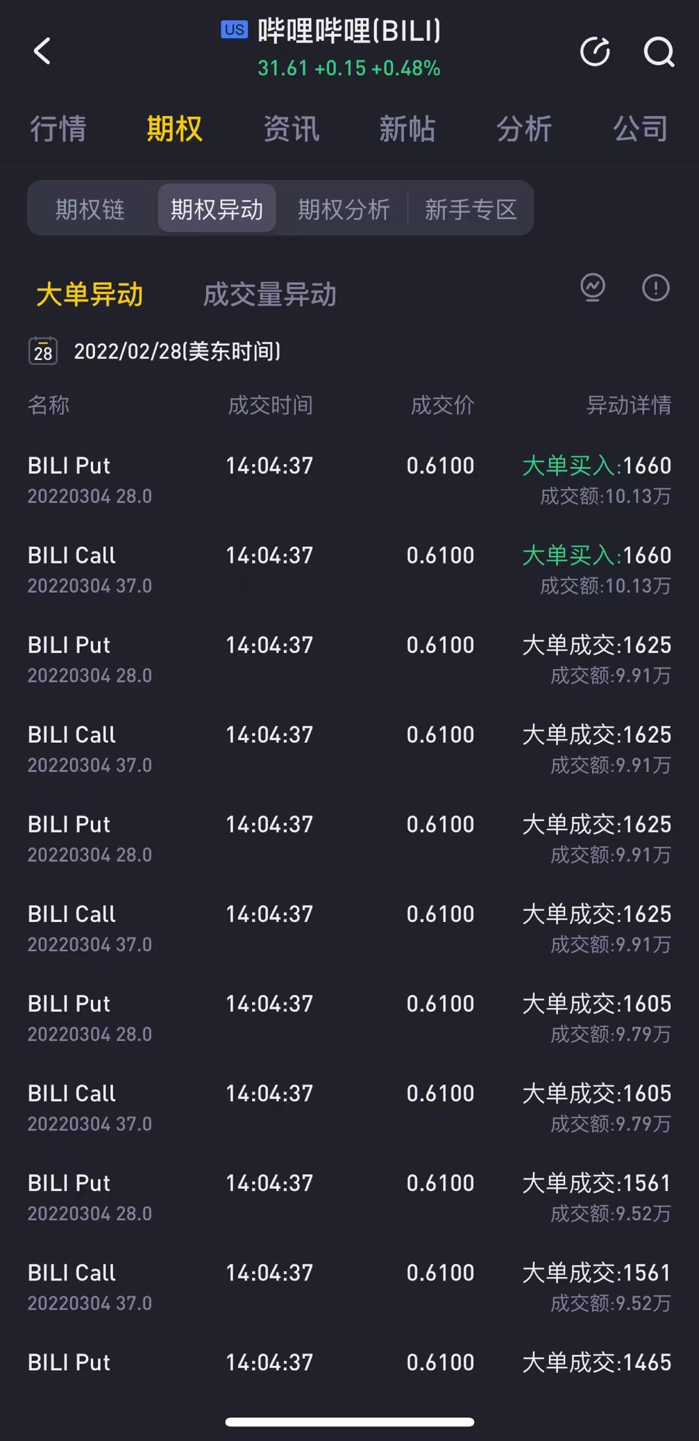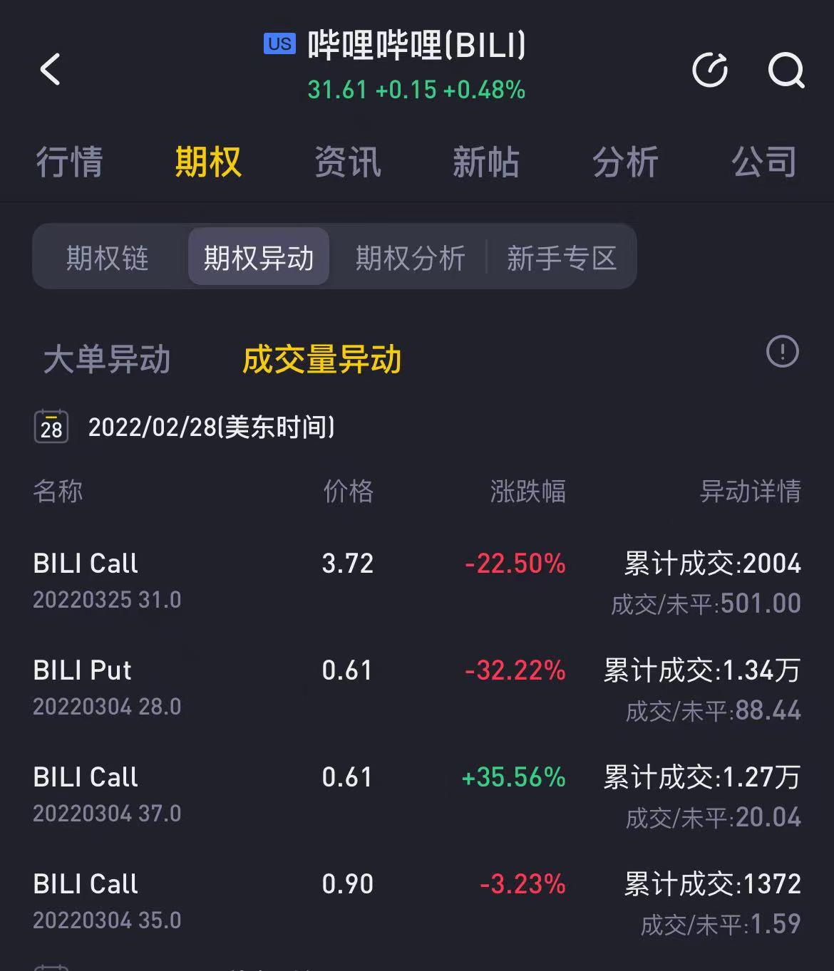 最后是$哔哩哔哩(BILI)$ 周四盘后财报,异动偏向跨式,大单异动分别是$BILI 20220304 28.0 PUT$ $BILI 20220304 37.0 CALL$。我个人偏向于像COST一样操作,买下周到期的call$BILI 20220311 35.0 CALL$然后周四平仓。