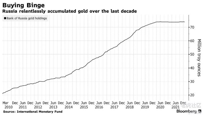 据国际货币基金组织数据,截止去年12月底,俄罗斯拥有的黄金储备量超过2000吨,占黄金储备的20%以上,俄罗斯是全球第五大主权黄金拥有国。