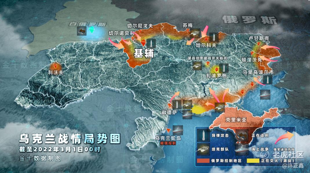 如上图所示,俄乌冲突进入第六日。昨日双方已经开始会谈,只不过以打促谈,边打边谈恐怕会成为将来一段时间的常态。很明显,双方目前的分歧很大:俄罗斯要求乌克兰去军事化、去纳粹化、保持中立,乌克兰的要价也不低,要去俄罗斯投降、撤军(而且是从克里米亚和乌东地区全部撤军)、赔偿。