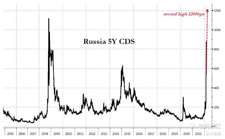 最后一项举措直接导致加密货币飙升,并且俄罗斯5年期信贷违约掉期(CDS)从早些时候的573个基点飙升至创纪录的1200个基点,即市场开始担忧俄罗斯4780亿美元外债中的很大一部分面临违约风险。不过由于我们大多数人都不涉及这两块市场,保持关注即可,防止其发生连锁反应。