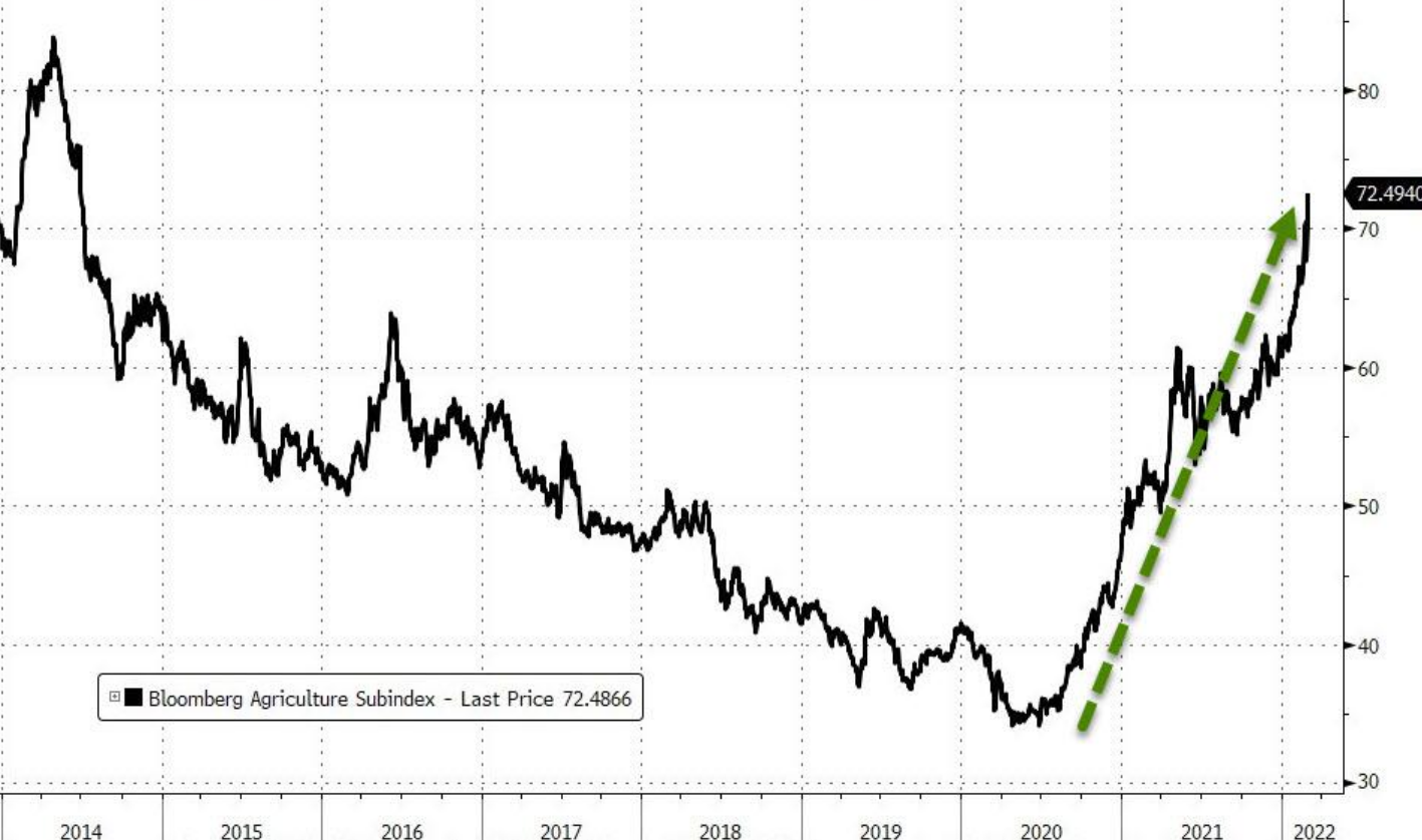 农产品的价格在乌克兰和俄罗斯的冲突发生之前,就已经开始了逐步攀升,由于市场此前一直在炒作拉尼娜因素导致的全球农产品产量下降,而且在最近几期的USDA农产品种植报告中,农产品的种植面积又普遍不及预期,全球的消费量又大,所以价格本来就处于上涨周期里,这再赶上乌克兰和俄罗斯之间的冲突爆发,好,农产品价格便开始了上无“天花板式”的起飞。