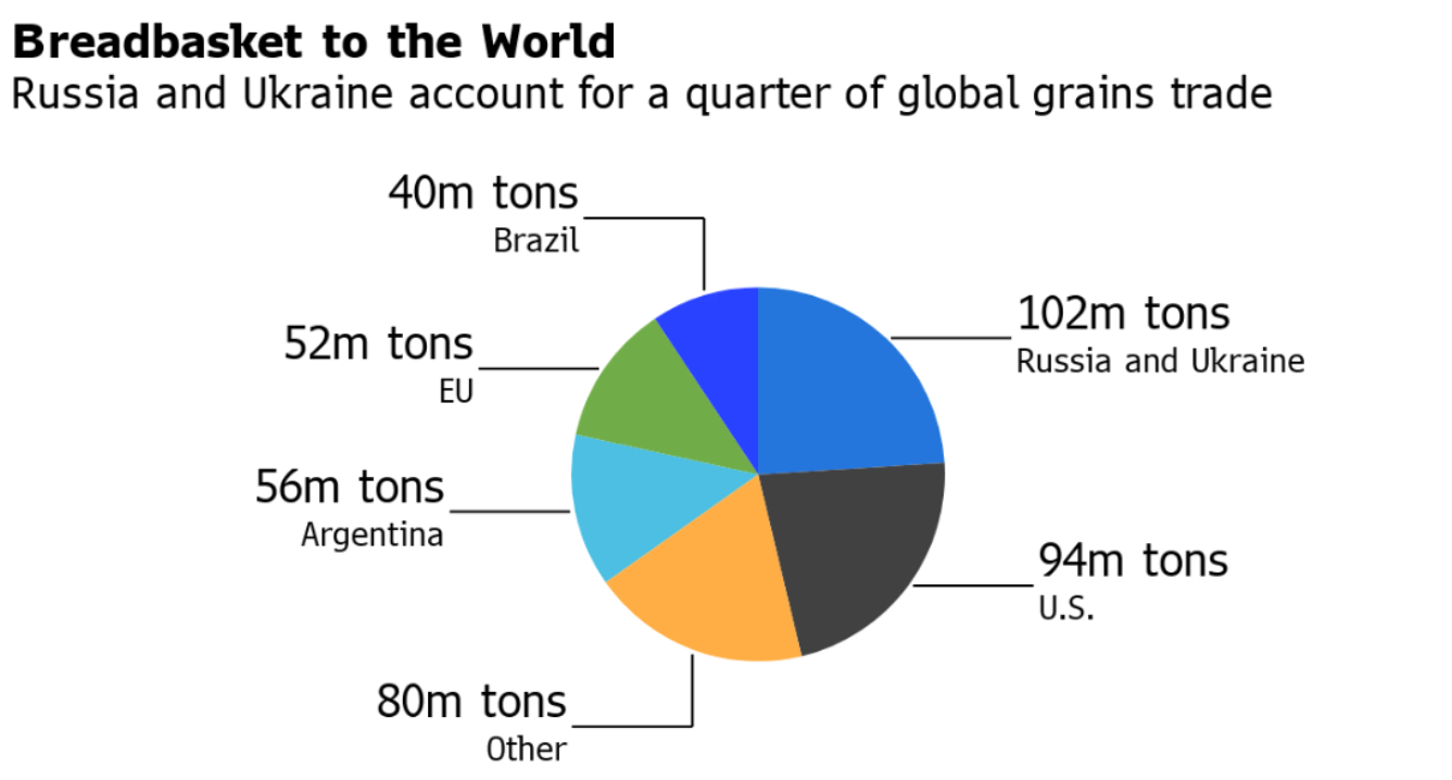 其次,乌克兰也是小麦的主要出口国,这俩国家占全球小麦贸易的四分之一以上,玉米的份额约五分之一。
