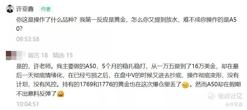 果然,对方回复,“是的,许老师。我主要做的A50,5个月的稳扎稳打,从一万五做到了16万美金,却在最后一天彻底情绪化,在已经亏损之后,盘中V的时候又进去抄底,操作彻底变形,没有计划,没有风控。持有的1769和1776的黄金也在这次爆仓里丢了,然而A50却在假期不出意料反弹了。”