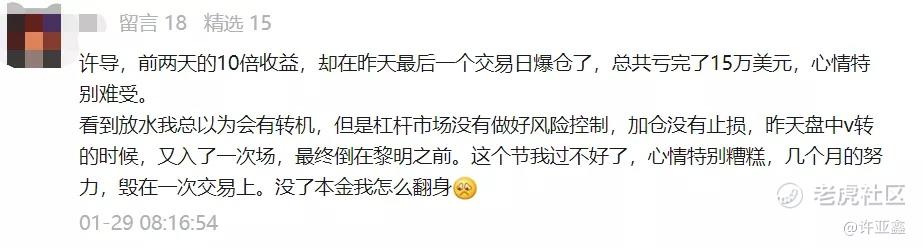 上周我在后台看到一条读者的留言,“许导,前俩天的10倍收益,却在昨天最后一个交易日爆仓了,总共亏完了15万美元,心情特难受。看到放水我总以为会有转机,但是杠杆市场没有做好风险控制,加仓没有止损,昨天盘中V转的时候,又一次(入)场,最终倒在黎明之前。这个节我过不好了,心情特别糟糕,几个月的努力,毁在一次交易上。没了本金我怎么翻身。”