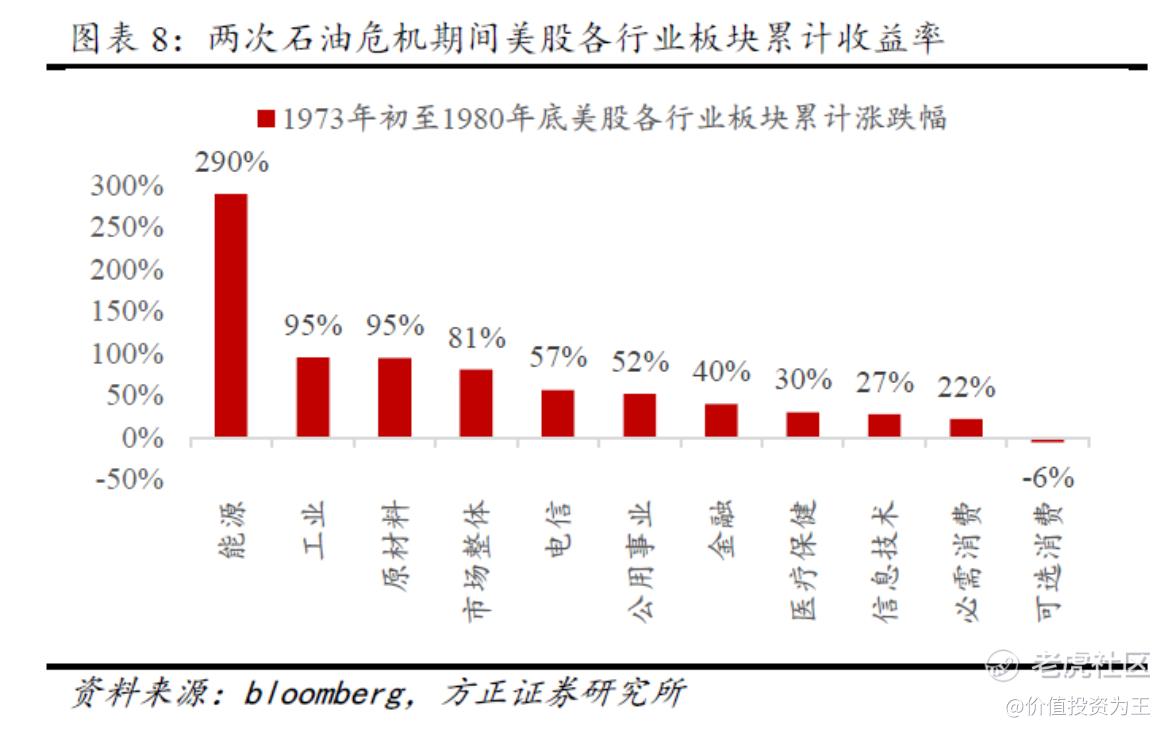最简单的逻辑就是能源板块了,两次石油危机期间,能源板块的涨幅高达290%,远高于其他行业。