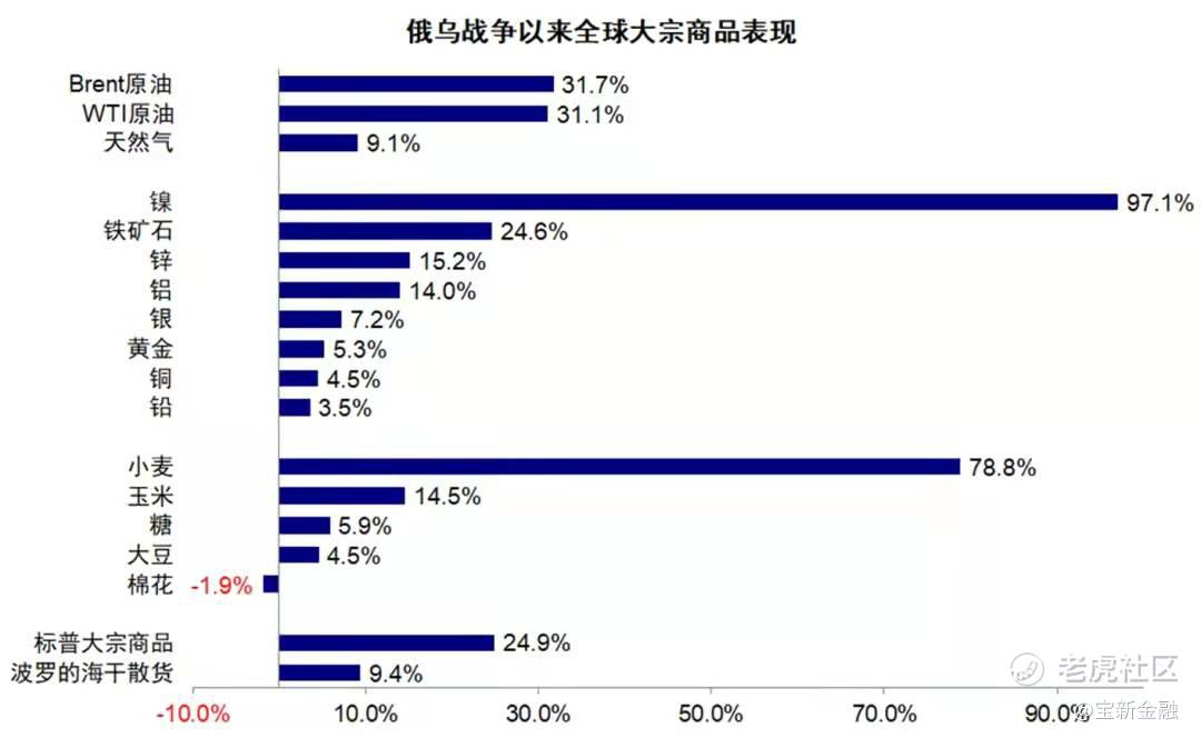 与熊市形成鲜明对比的是,大宗商品普遍大涨。布伦特油价一度逼近140美元/桶,创出2008年以来新高,WTI原油也逼近125美元/桶,小麦昨日大涨7%,LME镍涨幅更是高达74%。在避险与通胀情绪交织下,美元指数继续走强至99,黄金冲击冲高2000美元/盎司。