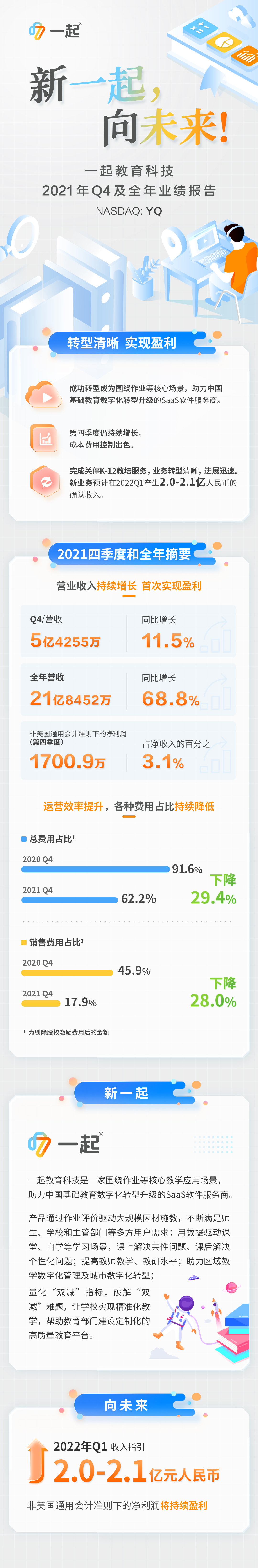 北京时间2022年3月9日,一起教育科技$一起教育科技(YQ)$公布了2021年第四季度及全年财报:在2021年第四季度,一起教育科技净收入5.425亿元人民币,同比增长11.5%,更重要的是在非美国通用会计准则下(Non-GAAP)净利润为人民币1700万,首次实现盈利。2021年度净收入为21.845亿元人民币,同比增长68.8%。