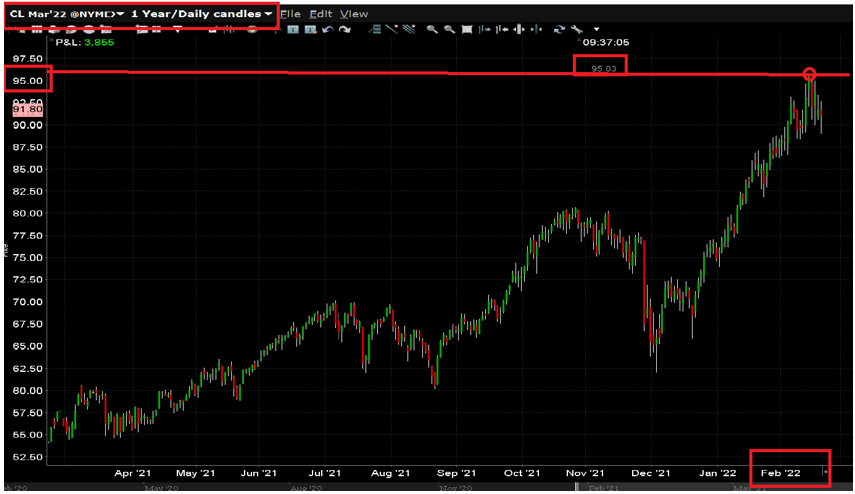美原油(WTI)主力合约三月份合约在上个星期一(2月14日)突破95.82美元,创下目前今年最高纪录(图1)。在此之后的一个星期,尽管国际宏观局势瞬息万变,俄罗斯、乌克兰危机日趋紧张,但原油市场还是进行了四天短暂的技术调整。