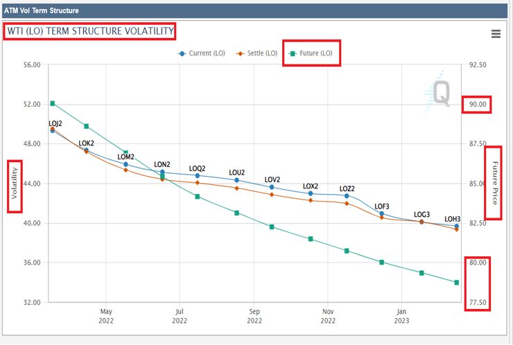 第二由于目前美原油价格结构是严重的现货升水。从下面QuikStrike期货升贴水和期权期限结构图中(图3)可以看到一年的美原油现货升水已经达到了13美元(图中绿线)。期货升贴水是一个经常被人们忽略的非常重要的期货交易概念。由于期货的长期贴水结构,所以随着时间的流逝,每一个月的期货合约都会在变成主力合约之后试图冲破由三月份合约创造的95.82美元这个阻力点,就像目前的四月份合约一样,站在90美元但同时还要继续向95.82美元这个阻力点重新挑战。这样时间就站在了市场熊的这一边。
