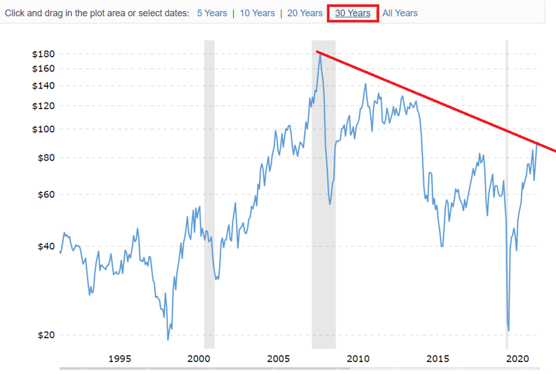 首先我们看到的是,从长期原油价格图表上看,目前的96美元是一个非常重要的长期价格阻力点。图2是美原油(WTI)主力合约三十年汇集的价格走向图。图中可以看到我们原油价格目前站在了历史的关键路口。