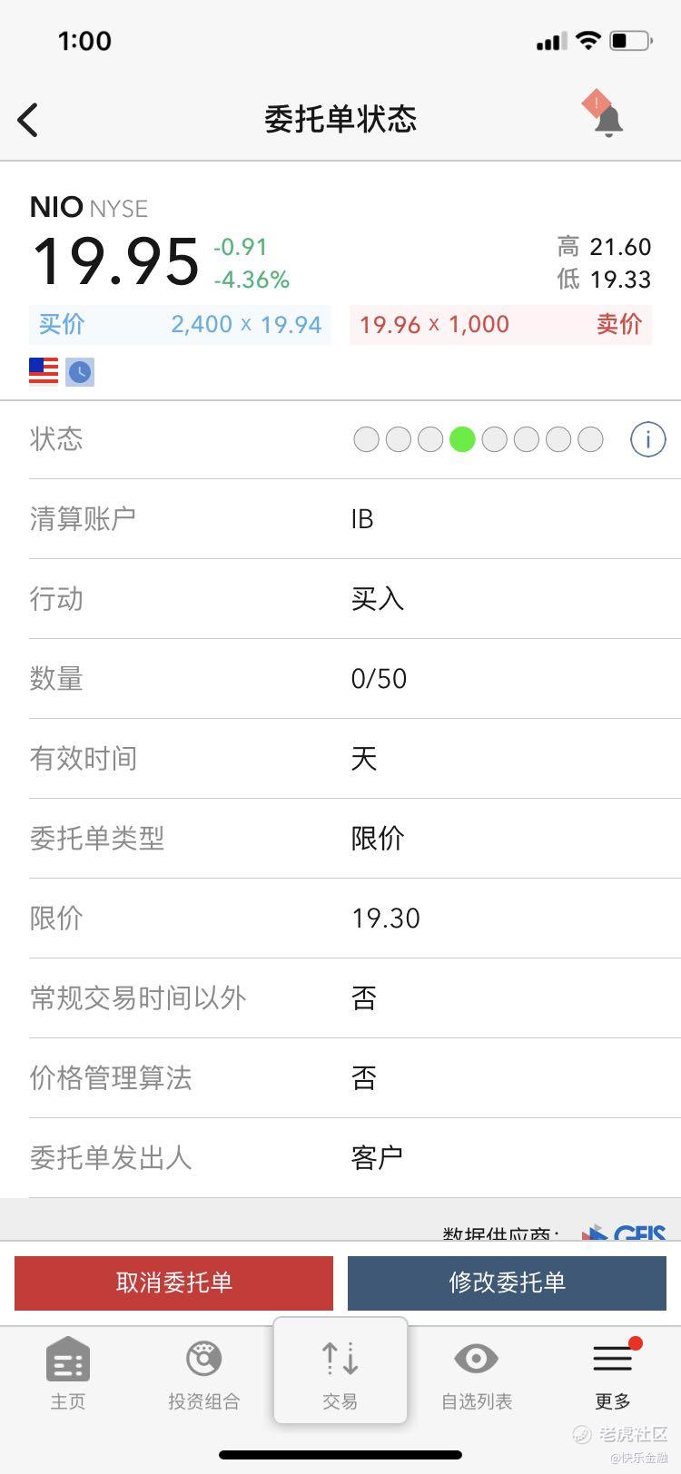 昨晚操盘计划在【NIO蔚来】下破20美元后,在19.30限价第一手挂单买入: